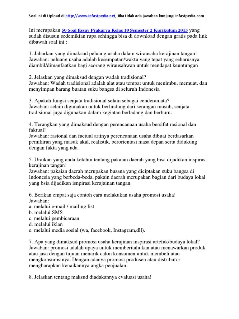 Soal dan jawaban essay prakarya kelas 11 semester 2. Smp negeri 1 kesamben : Kumpulan soal penilaian tengah semester (pts) atau ulangan tengah semester (uts) prakarya ini bisa kalian download secara gratis dari laman cara sunda. Soal pat/ukk prakarya kelas 7 dan kelas 8 ini bisa dijadikan bahan referensi dalam membuat soal penilaian/ujian lengkapi. Soal pilihan ganda bahasa indonesia kelas 7 semester 2 1. Hal tersebut dapat diamati dengan menggunakan………… a. Jabarkan yang dimaksud peluang usaha. Baik, pada post kali ini kita akan berlatih soal mapel prakarya kelas 7 smp/ mts semester 2 bab 1 kerajinan bahan limbah lunak. Berikut, soal essai prakarya dan kewirausahaan kurikulum 2013 edisi revisi dengan kunci jawaban untuk siswa sma/ma/smk/mak/sederajat. Deretan kata yang berhubungan dengan ekonomi adalah. Salam pendidikan, sampai jumpa sobat pengunjung setia blog ini. Semoga dapat membantu kalian semua. 10 soal pilihan ganda + kunci jawabannya, plus esay dan jawabannya.